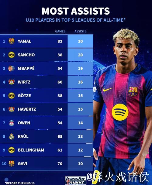 五大联赛历史U19助攻榜:亚马尔、桑乔、姆巴佩等名将上榜